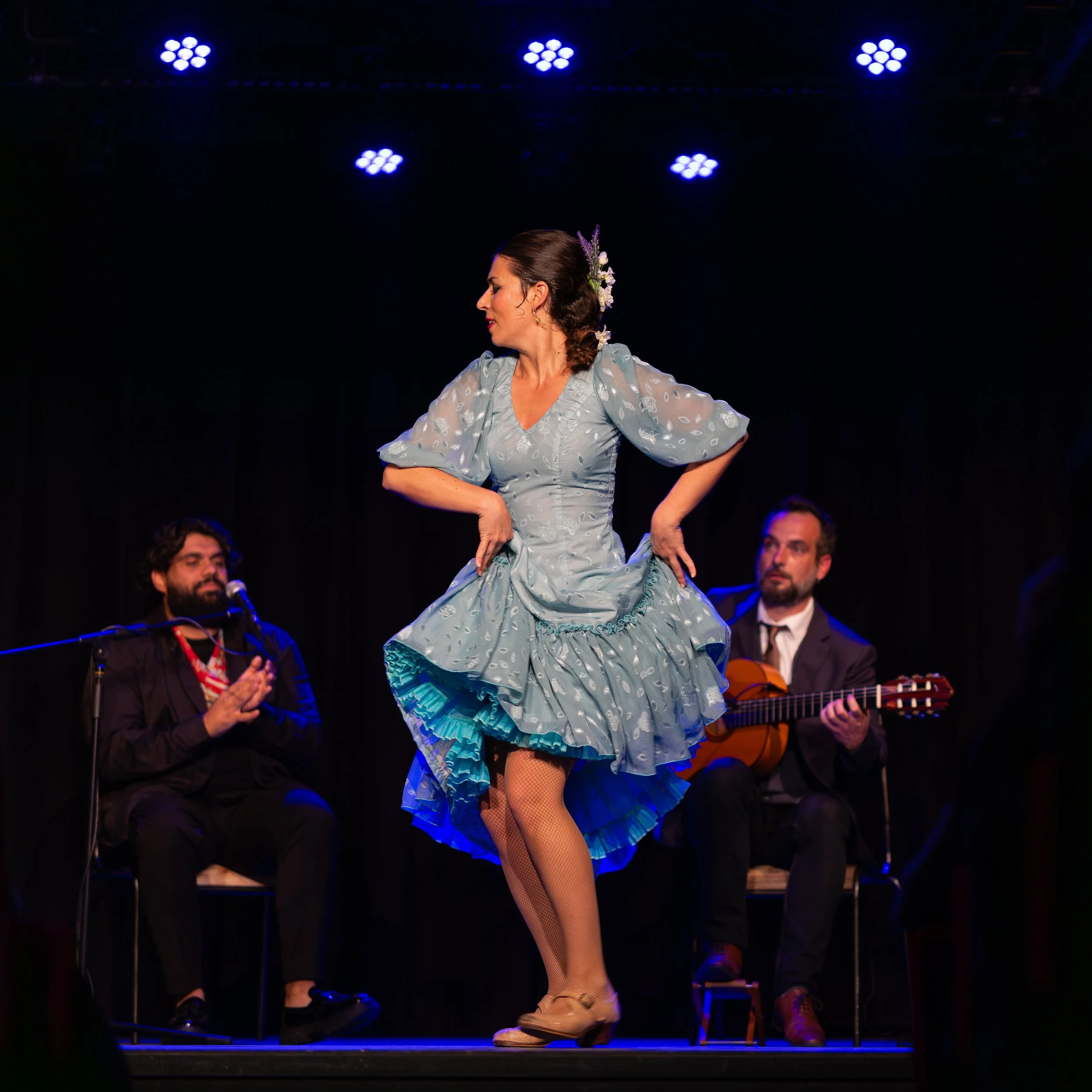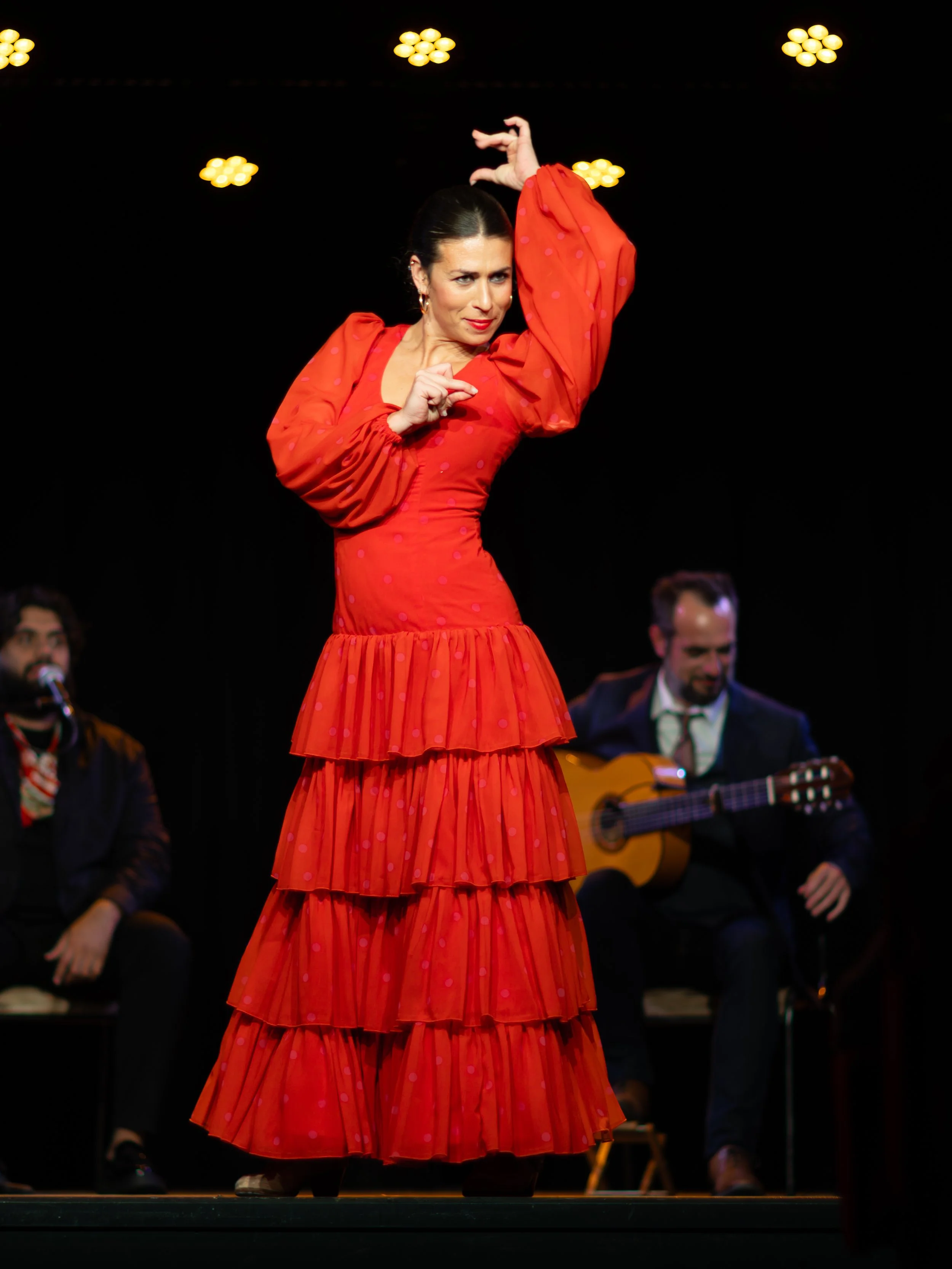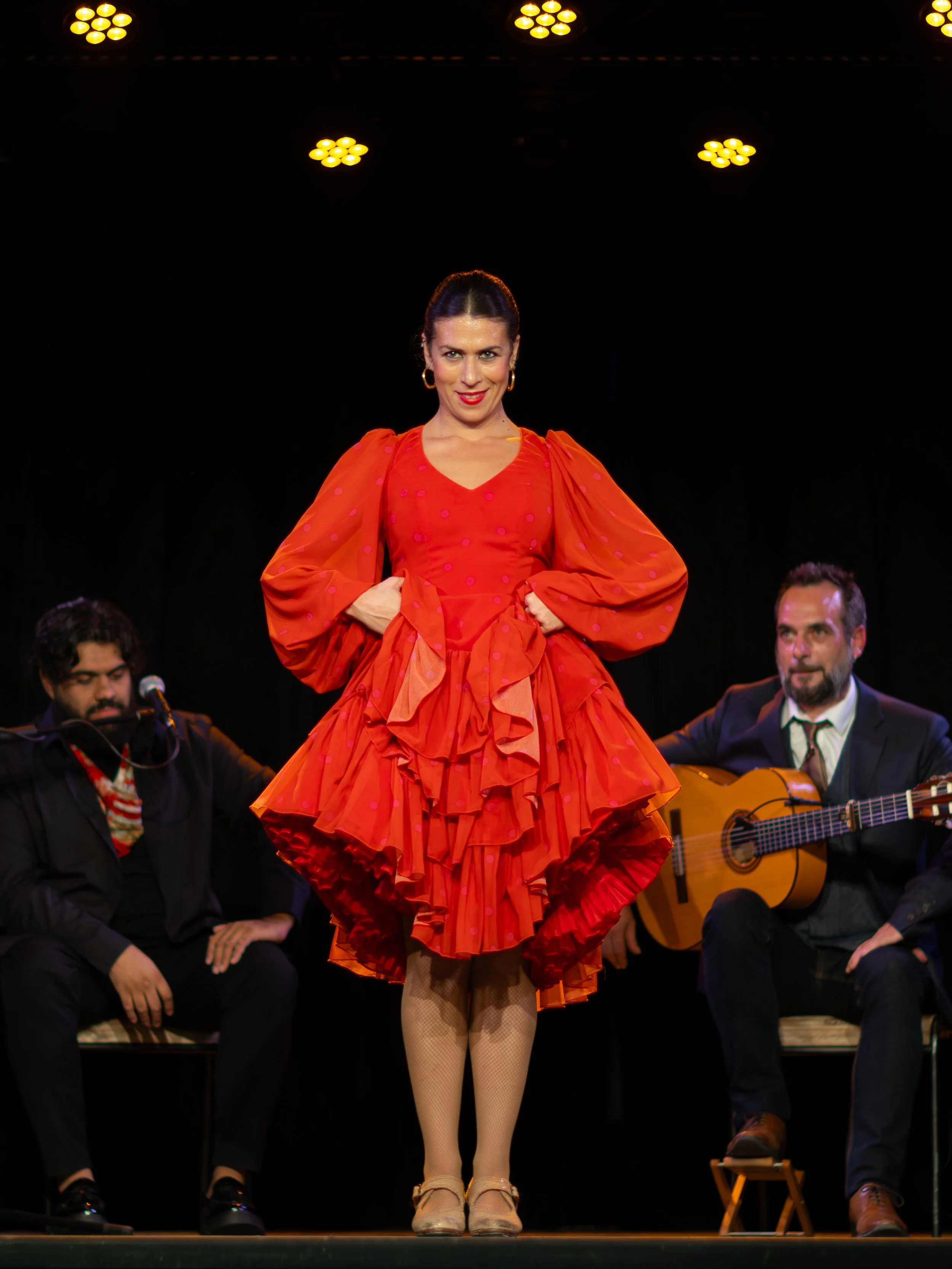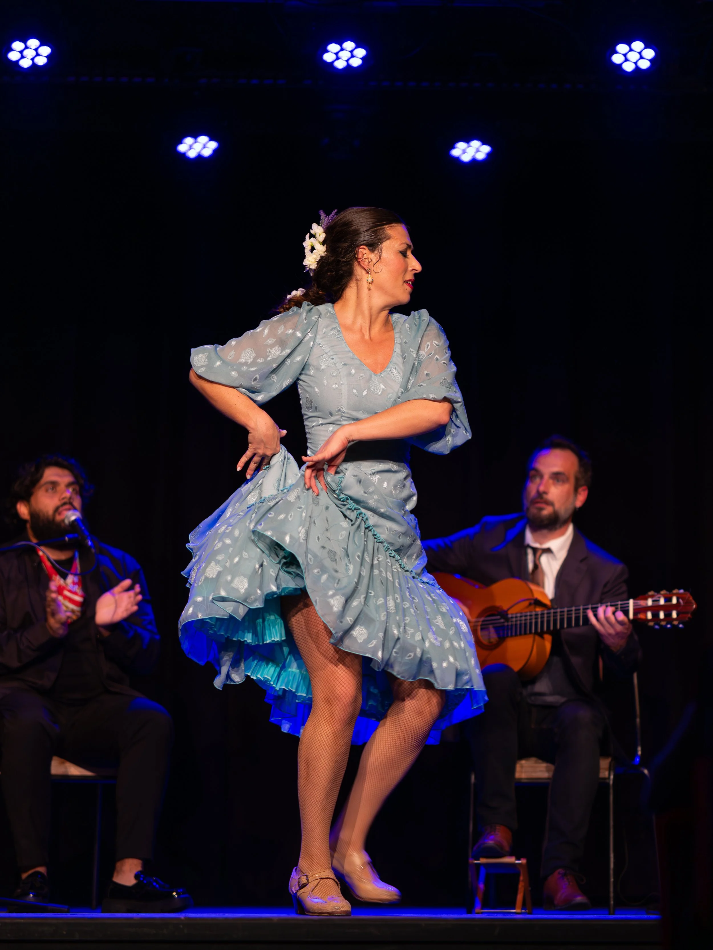 Ce que j’ai regardé ce jour là se matérialise en photos présentées ici dans une salle comble d’un public enthousiaste, évidemment connaisseur (du Flamenco et des acteurs présents sur scène), de Caroline David (chorégraphe et professeure de l’association), Ana Rebolo partageant avec elle la danse, Melchior Campos au chant, Leny Greff à la guitare, Alex Carrasco aux percussions et les élèves de l’association pour leur gala annuel.